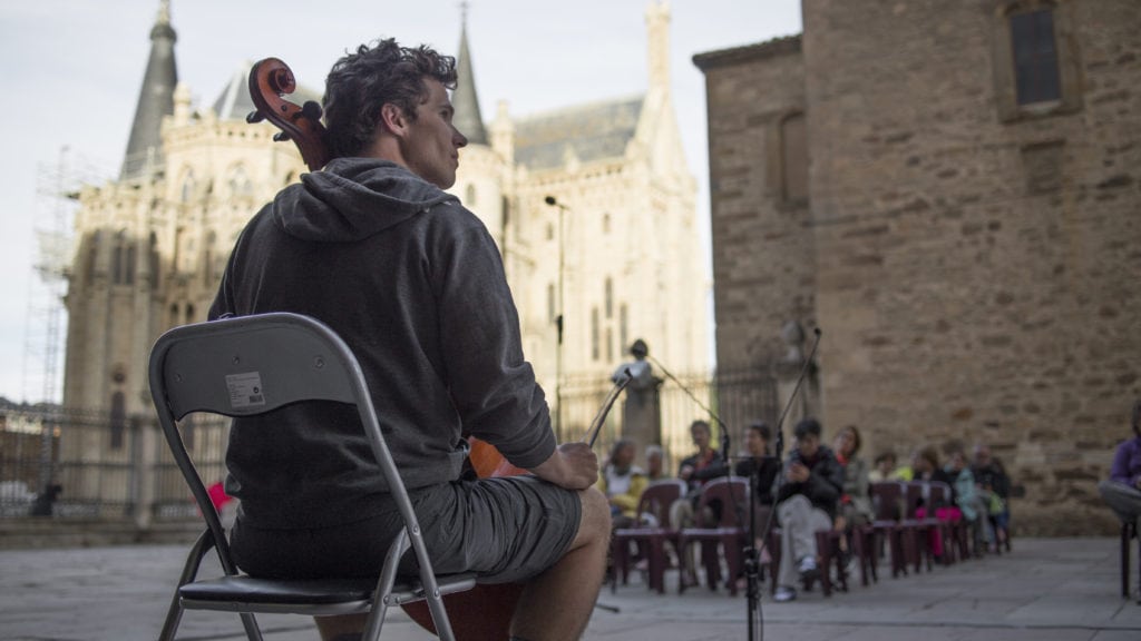This story of the Camino focuses on Dane Johansen, an American cellist, who walked the Camino with his cello on his back. In the evenings, he arranged to play and record six Bach suites for cello in 36 ancient churches along the way. We see a few of those concerts that he played after a long day of walking. His music often creates a background to accompany the scenery along the pilgrimage route.
